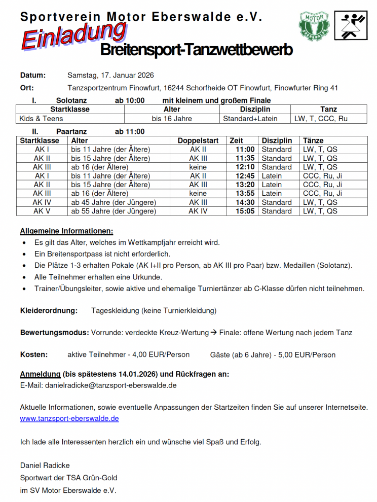 Nach den Sommerferien startet im Tanzsportzentrum Finowfurt eine neue Paartanz-Gruppe für Kinder ab 8 Jahren. Alle tanzbegeisterten Kids sind herzlich eingeladen, die Welt des Standard- und Lateintanzes zu entdecken. Die ersten zwei Trainingseinheiten sind Schnupperstunden – kommt einfach vorbei und probiert es aus! Bei Fragen oder für Voranmeldungen, nutzt bitte das Kontaktformular.